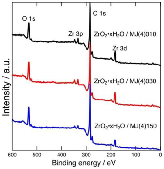 Figure 1 shows the wide-scan XPS of the prepared adsorbents. The spectra indicate that Zr was introduced onto mesoporous carbon. The peaks that appeared at 183 eV corresponded to Zr 3d of ZrO2·xH2O [12,20,21]. The two peaks that appeared at 330 eV corresponded to Zr 3p. The molar ratios (Zr:C) of the prepared adsorbents calculated based on peak area were 95:5 for MJ(4)010, 95:5 for MJ(4)030 and 97:3 for MJ(4)150. The Zr content measured in the case of MJ(4)150 was slightly smaller than others; the mesopore of MJ(4)150 may have been too loose to trap ZrO2·xH2O fine particles firmly. Note that XPS analysis may not provide a precisely quantitative composition, especially in the case of porous materials. The gravimetric analysis results described below provide the sample compositions.