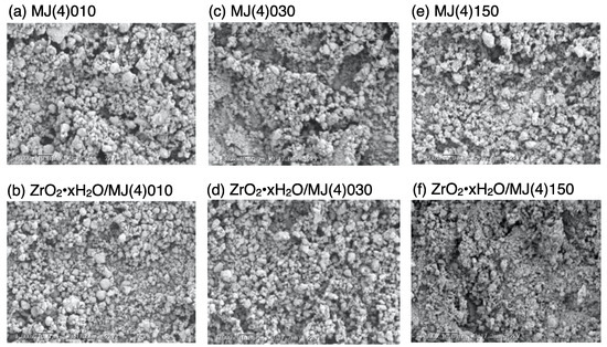SEM images of the prepared adsorbents and the unmodified carbons: MJ(4)010 (a), ZrO2·xH2O/MJ(4)010 (b), MJ(4)030 (c), ZrO2·xH2O/MJ(4)030 (d), MJ(4)150 (e), and ZrO2·xH2O/MJ(4)030 (f).