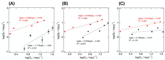 Adsorption isotherms of the prepared adsorbents and the mesoporous carbons: MJ(4)010 (A), MJ(4)030 (B), and MJ(4)150 (C). The red and the black markers indicate the data obtained for the ZrO2·xH2O/mesoporous carbons and the unmodified mesoporous carbons, respectively. Equations of the Freundlich isotherm are also shown.
