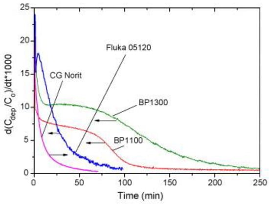 Decline in deposition rate (normalized to initial carbon mass), and variability for different carbon blacks (BP1300, BP1100, Fluka 05120), and an activated carbon (CG Norit) [34].