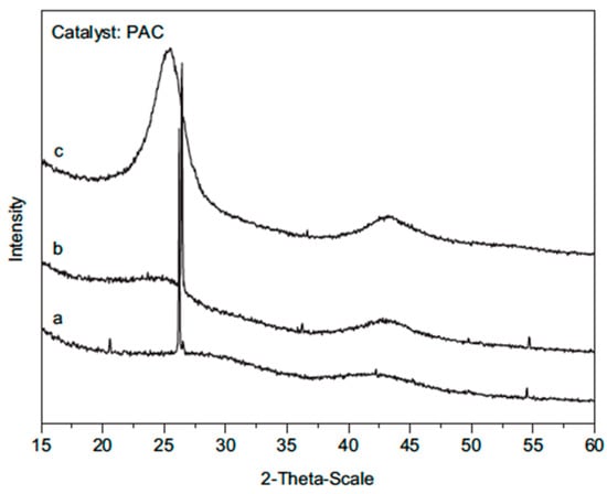 XRD spectra of AC samples: (a) fresh; (b) after reaction with pure methane at 850 °C; (c) after reaction with a mixture of 80% methane, 20% propylene at 850 °C [72].