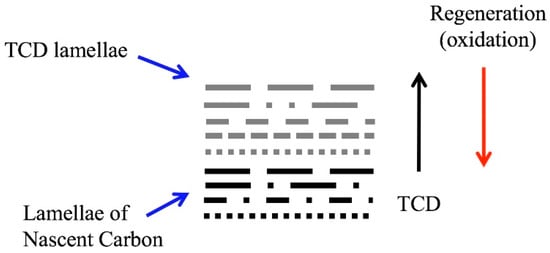 In fact, despite the perception conveyed by Figure 5, regeneration is not merely the uncovering of an underlying carbon layer or re-exposure of an earlier stage of the deposit. Carbon mass is removed as a result of atom-by-atom oxidation or gasification (using H2O or CO2). As earlier stages of deposition are reached (and ultimately the original catalyst) with continued regeneration, the surface will not be as deposited, but instead possess numerous vacancies and edge and radical sites—reflecting the atomic-scale “excavation.” Such degradation of the lamellar nanostructure and the breakup of sp2 networks therein are highly advantageous, as they account for the increase in active sites by regeneration. As such, sites become more numerous; the regeneration rate also increases. Correspondingly the TCD reactivity increases too.