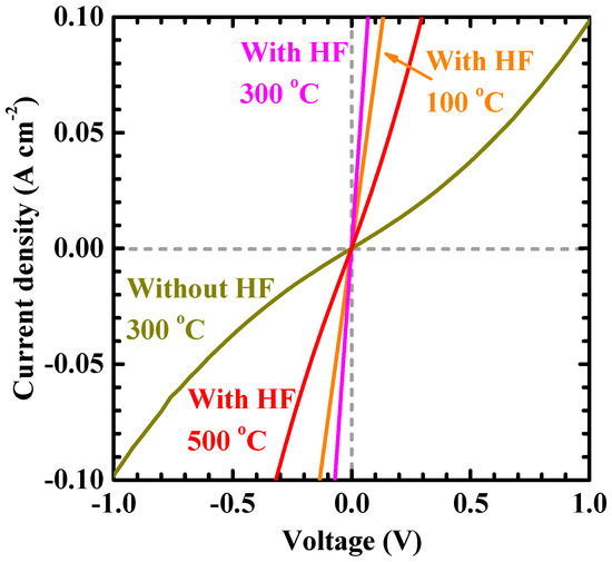 Current–voltage characteristics across the bonded interfaces with HF surface pretreatment bonded at 100, 300, and 500 °C, and without HF surface pretreatment bonded at 300 °C for bonding approach (1).