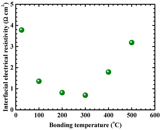 Dependence of the interfacial electrical resistivity on bonding temperature for the samples with HF surface pretreatment for bonding approach (1).