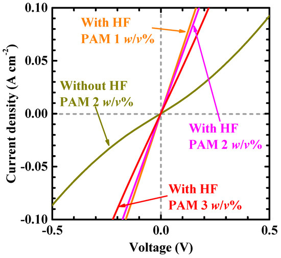 Current–voltage characteristics across the bonded interfaces with HF surface pretreatment bonded at room temperature with polyacrylamide (PAM) concentrations corresponding to 1, 2, and 3 w/v %, and without HF surface pretreatment bonded at room temperature with a PAM concentration of 2 w/v % for bonding approach (2).