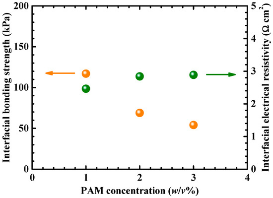 Dependences of the interfacial mechanical bonding strength and electrical resistivity on PAM concentration for the samples with HF surface pretreatment bonded at room temperature for bonding approach (2).
