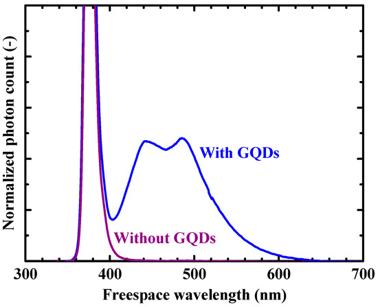 In contrast to approach (1), no degradation was observed in the optical property, even after the dry out of the samples for bonding approach (2), due to the use of the hydrogel material. This result can be potentially attributed to the effects of the surface passivation and/or aggregation suppression of the GQDs [39,45]. Figure 7 shows the photoluminescence spectra of the bonded glass samples with and without GQDs. The mild twin peaks that were observed around 440 and 490 nm were presumably due to possible bimodal size distribution of the GQDs. The change in the spectrum of the photon count in Figure 7 verifies that the GQDs embedded in the bonded interface converts the incident light peaking at approximately 380 nm into another bundle of light peaking at approximately 450–500 nm. This type of optical wavelength conversion can be utilized in applications involving solar cells, where the interfacial GQDs absorb ultraviolet light (380 nm) and emit visible light (450–500 nm) to fit the solar spectral irradiance to the crystalline silicon absorption spectral sensitivity. However, the proposed GQD-bonding scheme can be used, irrespective of the material species. Hence, the most suitable combination of semiconductors can be selected on demand for each application. The tunability of the absorption and emission wavelengths via the quantum-dot size is advantageous for the adjustment of each application. Moreover, the use of an ensemble of dots with a size distribution can fit some of the applications, such as photovoltaics, in response to the broad solar spectrum. In this study, we demonstrated photonic down conversion by GQD, but not up conversion. However, with down conversion, the implementation of an efficient GQD-mediated interface in a multijunction solar cell might not be trivial because it would require a relatively large separation in the bandgap energies between the top and bottom subcells, such as that in an (Al) (In)GaN–Si combination. In contrast, up-converting GQDs [32,33,34] could be more beneficial in such an application. For two-dimensional graphene sheets, albeit not quantum dots, we previously developed graphene-mediated semiconductor wafer bonding to form a Si/graphene/Si double heterostructure [46]. Hence, we demonstrated the preparation of two types of graphene-based-material-cored double heterostructures that can provide a basis for high-performance nanophotonic devices in the future.