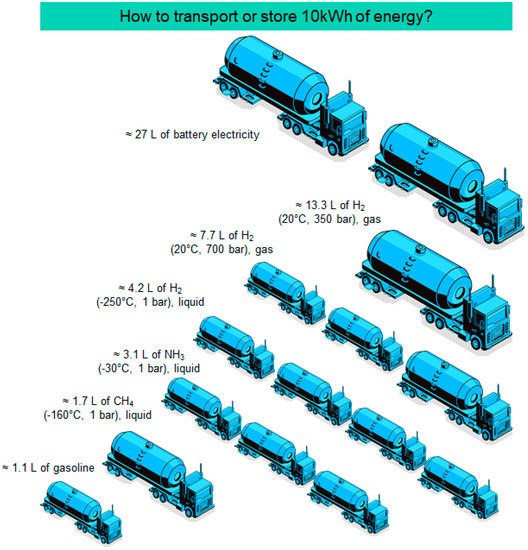 Figure 1 summarizes the volumetric energy issue by illustrating the volumes needed to store or transport 10 kWh of energy using different energy vectors: battery electricity, hydrogen (liquid or at pressure), liquid ammonia (NH