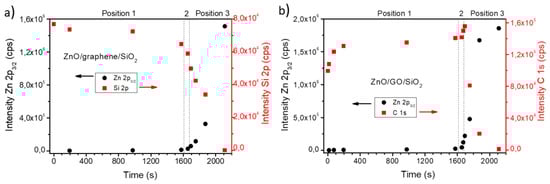 XPS intensities of the Zn 2p 3/2 (dots) and Si 2p/C 1s (squares) peaks versus evaporation time for the growth of: (a) ZnO/G/SiO2 and (b) ZnO/GO/SiO2.