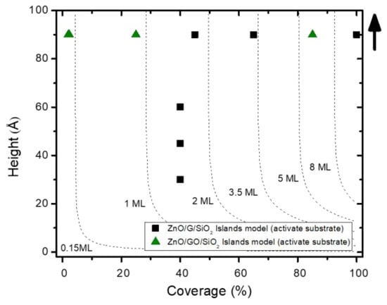 XPS measurements can also provide deeper insights the details of the growth mode by analyzing the inelastic background (inelastic peak shape analysis (IPSA)). In this case, the probing depth was extended to several times the IMFP, as this background contains electrons that have lost part of their energy by inelastic processes that depend, among other factors, on the spatial distribution of the atoms that contribute to the signal (to the emission or/and to the inelastic scattering). Therefore, this analytical method gives the opportunity to derive the surface morphology that gives rise to the shape of the inelastic background. This method has been included in the QUASES software [46]. The survey XPS spectra for different stages of growth on both substrates were analyzed in terms of islands model (active substrate), and the results are depicted in Figure 2. For the G/SiO2 substrate (black squares), this study could not be performed for the spectra recorded at position 1, since the signal-noise ratio was very low due to the small amount of deposited material. Nevertheless, this fact would indicate that in the early stages of growth, the nucleation limits the surface coverage. Once the sample is located at position 2, the growth is characterized by a fast coverage of the surface (up to a 40%) with islands growing from 30 to 60 Å. These structures are too thick for a surface sensitive technique such as XPS (30 Å is more than three times the ZnO estimated IMFP) and would explain the limited increase on the XPS intensity, even for such big clusters. For subsequent depositions at position 3, the coverage increases until the coalescence and the height of these structures saturates at 90 Å, which is close to the limit of the IPSA method, taking into account the current IMFPs (further tuning to higher height values does not translate into background changes). For the GO substrate (green triangles), the mode of growth is simpler, characterized by a very slow nucleation process and by the growth of big clusters. Even for the early stages of growth, the height of ZnO structures reaches the maximum (90 Å). This means that the XPS intensity measured in Figure 1b is limited and controlled by the percentage of surface coverage.