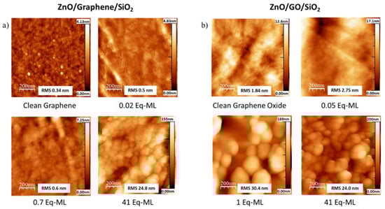 The AFM topography images for different stages of growth of ZnO on G/SiO2 and GO/SiO2 are shown in Figure 3a,b, respectively. The first images of each panel correspond to the clean substrates. In the graphene case, the SiO2 support can be seen underneath and some further images show the characteristic graphene wrinkles. Although ZnO deposits can hardly be observed in the AFM images due to the small amount of deposited material (especially during the very first steps), some slight changes on the contrast appears. In particular, the root mean square (RMS) increased with the deposition time and serves as a good indicator of the deposition. However, for deposition of 0.7 Eq-ML, the AFM image clearly shows the formation of small ZnO islands with lateral size of 30–50 nm and few nanometers high, which gradually increased in size and height until the last stage, when the entire surface is covered. For the GO, the initial substrate already shows higher values of RMS than as-transferred graphene. However, similarly to the previous substrate, the ZnO grains were observed for deposits around 1 Eq-ML (calculated by XPS). As expected from IPSA analysis, the grains were bigger in size, with diameters around 200 nm and heights close to 90 nm. Therefore, the ZnO growth on graphene appeared to be smoother than on GO in the very early stages of growth, even though for larger deposits near to the coalescence of the RMS values became similar (see complete evolution of the RMS roughness for both substrates in Figure S2).
