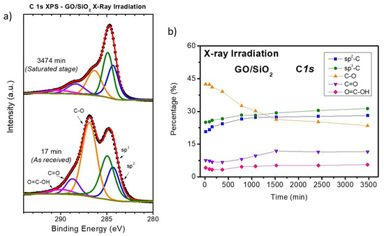 (a) Fitted XPS C 1s spectra of as received GO/SiO2 (bottom) and GO/SiO2 after 3474 min of X-ray irradiation (top). (b) Relative intensities of the XPS C 1s contributions used for the fitting in (a) as a function of irradiation time.