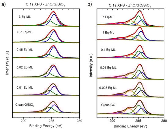 In-situ C 1s XPS spectra for (a) ZnO/G/SiO2 and (b) ZnO/GO/SiO2 for a selected set of deposition stages.