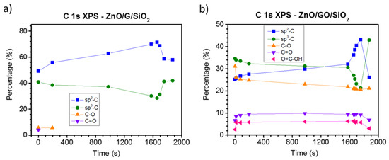 Relative intensities of the XPS C 1s contributions used for the fitting of the spectra in Figure 5 as a function of evaporation time for ZnO on (a) G/SiO2 and (b) GO/SiO2.