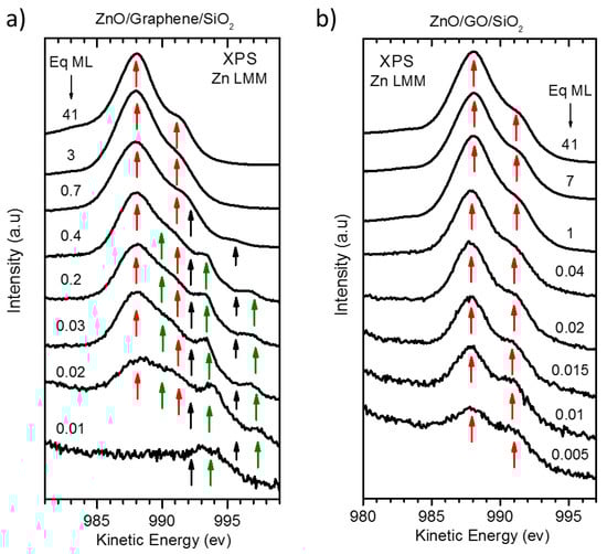 Now we will focus on the chemical analysis of the deposited ZnO. Contrary to other transition metal oxides, the complete Zn 3d orbitals block the appearance of complex and intense shake-up contributions in the Zn 2p region [61]. Nevertheless, the Auger L3M45M45 transitions involve both Zn 2p and Zn 3d orbitals, and as long as Zn 3d states partially participate in the bonds of the compound [62,63], these Auger transitions will be sensitive to the chemical environment and, thus, to the oxidation state of Zn atoms [64]. Figure 7 shows the Auger Zn-LMM spectra of both deposits as a function of the coverage. At first glance, the growth on both substrates presents important differences. Regarding the G/SiO2 substrate, Figure 7a shows a complex shape of the spectra that results from a simple mixture of ZnO and metallic Zn reference spectra. A typical ZnO spectrum is characterized by a maximum peak at a kinetic energy (K.E.) of ~998 eV with a shoulder at higher energy, whereas metallic Zn shows a double sharper structure with energy positions of ~992 and ~995 eV (once the background is subtracted, see Figure 8b,e). However, the Zn-LMM spectra measured at the early stages of growth showed three more contributions (as shoulders) at ~990, ~994 and ~997 eV (green arrows in addition to ZnO (red arrows) and Zn (black arrows) contributions. These extra components gradually disappeared until the final shape for large coverages, corresponding to ZnO oxide. On the other hand, the growth on GO is much simpler, showing almost the same spectral shape for all deposition steps corresponding to ZnO (see Figure 7b).