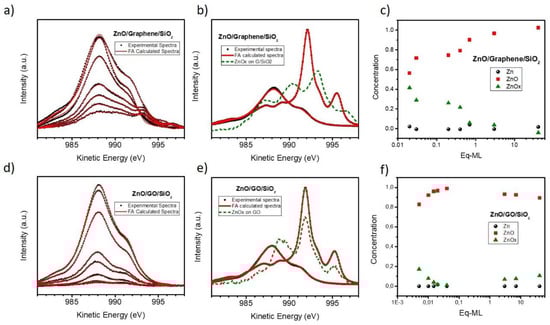 Results of factor analysis applied to the Zn-LMM XPS spectra for the growth of ZnO on G/SiO2 (a–c) and GO (d–f). (a) and (d): Calculated and suggested bases used in factor analysis. (b) and (e): Fittings of the experimental spectra using a linear combination of the proposed components. (c) and (f): Concentration for each of the components as a function of the coverage.