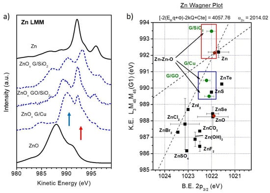 In spite of the similar chemical composition of the ZnO deposits grown on G/Cu, G/SiO2 and GO (i.e., mixture of different amounts of ZnO, Zn and ZnOx with a final predominance of the oxide), there are some clear differences, especially for the early stages of growth. Figure 9a shows from bottom to top the Zn-LMM Auger spectra of stoichiometric ZnO, ZnOx sub-oxide, related to G/Cu, G/SiO2 and GO, and metallic Zn, where G/Cu data have been taken from [39]. As described above, the three ZnOx components show similar shapes, but the relative intensities of the ~990 eV and ~993 eV Auger structures are different. The first one dominates on G/Cu and GO (as previously argued, this is the one that has physical meaning for GO case), whereas for G/SiO2 the second one gains in intensity. Figure 9b shows the Wagner plot for Zn atoms in different compounds [66], which is a very powerful tool to study initial and final states of compounds. The values marked as red solid circles have been obtained from the Zn-LMM Auger spectra measured by us from ZnO and Zn reference samples, whereas the values marked as green solid circles correspond to each of the ZnOx sub-oxide spectra above described. Other Wagner values for different zinc compounds from the literature are marked as black squares. The Wagner plot consists in depicting the K.E. of the Auger transition as a function of the binding energy (B.E.) of the corresponding photoemission peak . From this representation, information from initial and final states can be obtained. On the one hand, the Auger parameter is defined as although, as shown elsewhere [65,67], this expression can be set as , where is a constant for each element and is the relaxation energy of the core level L3. Thus, straight lines with slope + 1 in the Wagner plot will correspond to compounds of that specific element with the same relaxation energy, i.e., same final state. Moreover, it has been also shown that , where the term is related to initial states. Accordingly, straight lines with slope +3 in the Wagner plot correspond to atoms with the same initial states. It is true that this simplified picture is only valid for core levels, which contrast with the fact that Zn 3d orbitals participate on the valence band. However, their hybridization is limited to a 10% in the case of ZnO [62,63], what makes us feel confident on the fact that the previous equations remain valid for the case of Zn atoms. More details regarding this discussion can be found elsewhere [39]. Blue and red squares in the Wagner plot correspond to the areas where the ~990 eV and ~993 eV peaks of the different ZnOx may appear (pertinent blue and red arrows representing these peaks are drawn in Figure 9a). As it can be seen, in both cases the areas are close and along the line with slope +3, corresponding to the same initial state than metallic Zn. This could be explained by an oxidation state lower than +2 expected for a Zn sub-oxide. In addition, the peak at ~990 eV shows a relaxation energy between metallic Zn and ZnO. The relaxation energy is composed by three terms: , where is related to the reconfiguration of the Zn electrons, refers to the relaxation energy of the electrons transferred to the valence band from the nearby atoms and finally is the relaxation energy related to the dipoles induced in the surroundings by charge transference. As is constant for all Zn compounds, the differences of the Auger parameter, and thus on the relaxation energy, between two Zn-LMM contributions, is given by . From this expression, the variation of the Auger parameter of ZnOx and Zn would be established by differences of charge transfer from the Zn environment to screen the hole created by the emitted electron. In particular, as suggested previously [39], this could be related to charge transfer from Zn atoms, where oxygen is not able to strongly bond and the ionic character of the sub-oxide decreases compared to ZnO, reducing the extra-atomic term.