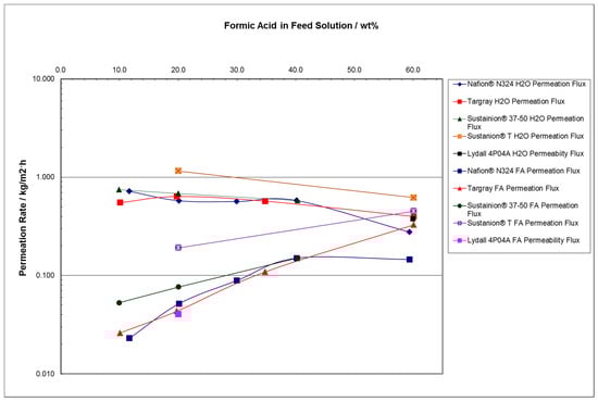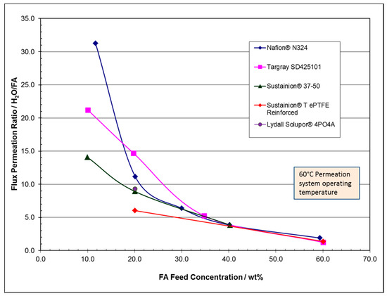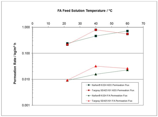 - At FA feed concentrations of 10 to 25 wt%, the water permeation mass flux rate was found to be relatively constant for most of the membrane separator materials, around 0.78 kg/m2 h for H2O and a much lower mass permeation flux rate for FA at 0.026 kg/m2 h for temperatures in the 22 to 60 °C range.