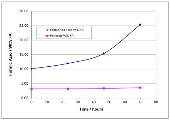 - At 30 to 60 wt% FA feed concentrations, the water permeation mass flux rate is lower, and the FA permeation mass flux rate increases to about 0.10 kg/m2 h for FA feed concentrations above 30 wt%.