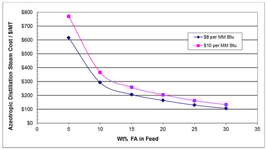 3.4. Energy Steam Cost Estimates for Concentrating FA in an Azeotropic Distillation Tower