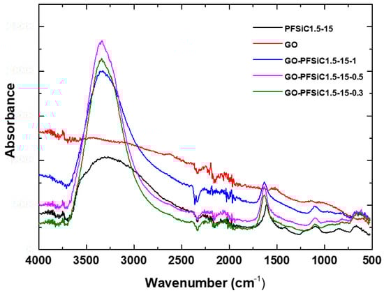The characterization of the new composite materials by using FTIR measurements was carried out to confirm the bonding or types of functional groups of molecules that are being present in the GO and can be impregnated into the new GO-PFSiC materials. FTIR analysis was performed at wavenumbers 400–4000 cm−1, where in this range the characteristic absorption of functional group vibrations, as presented by the GO and the composites, can be identified. In Figure 1, the FTIR spectra can be shown, comparing the different examined materials, i.e., GO, PFSiC1.5-15, GO-PFSiC1.5-15-1, GO-PFSiC1.5-15-0.5, and GO-PFSiC1.5-15-0.3. In the FTIR spectra, primary hydroxyl C–OH (1380 cm−1) groups, epoxy C–O groups (1186 cm−1), and carbonyl C=O (1820 cm−1) groups can be detected in the GO spectrum, which reveals that large numbers of oxygen-containing groups have been introduced/interact into/with the GO structure [,]; noting also that there is an absence of absorption at the wavenumber 1725 cm−1, which matches with the characteristics of C=C aromatic stretching vibration, indicating that GO is completely oxidized [].
