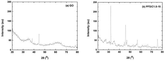 The results obtained from the XRD analysis are presented in Figure 3 for the cases of GO (Figure 3a), PFSIC1.5-15 (Figure 3b), and GO-PFSiC hybrids (Figure 3c–e). From the XRD patterns, similar diffraction peaks at 35.6°, 43.3°, 53.6°, 57.3°, and 62.8° in Figure 3b–e can be detected, which are the characteristic peaks of cubic Fe [], indicating that the respective peaks of PFSIC1.5-15 are formed in the composites and that the PFSiC particles are distributed uniformly on the surface of graphene, which was also confirmed by the SEM images (Figure 2) [].