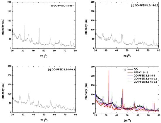 XRD diagrams of the examined materials; (a) GO, (b) PFSiC1.5-15, (c) GO-PFSiC1.5-15-1, (d) GO-PFSiC1.5-15-0.5, (e) GO-PFSiC1.5-15-0.3, and (f) comparison between them.