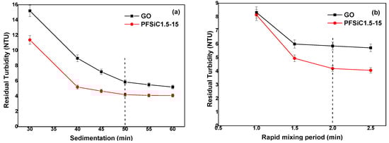 In Figure 4, the results of the experiments, as applied for the determination of optimum coagulation conditions during jar-test experimental runs, are presented. For this reason, GO and PFSiC1.5-15 were compared, regarding the removal of turbidity and expressed as the residual turbidity (NTU), (a) in different sedimentation times, and (b) in different rapid mixing period times (Table 3), based on previous research tests [], by using 10 mg/L as an indicative dosage.