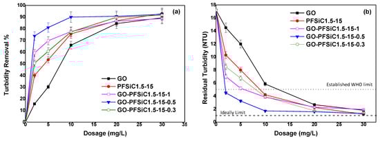 The effect of pH on the coagulation ability of optimal GO-PFSiC1.5-15-0.5 material, as obtained from the previous experiments, was examined in the pH range 4–9, by using 10 mg/L of GO-PFSiC1.5-15-0.5. The removal of turbidity, expressed as percentage (Figure 6a) and as residual values (NTU) (Figure 6b), is presented in Figure 6. According to the results, it is found that the treated water by the composite material GO-PFSiC1.5-15-0.5 can follow the respective legislation (by WHO) limits with an increase of pH values over 8. In particular, at more alkaline pH values (>7.9), the removal of turbidity reaches 96%, by applying only the 10 mg/L dosage, while in pH 6, where very small flocks rather slowly formed and barely settled, the relative percentage decreases significantly (68%). However, at pH 4–5, the turbidity removal efficiency was highly improved (up to 75–85%), in accordance with the relevant literature []. The original pH value of the examined simulated surface water (at pH 7.6 ± 0.2) was in the optimum pH range for the treatment of turbid water samples, in agreement with Figure 6. In strong alkaline media, the formation of flocks was very quick and began even from the first minute of high-speed agitation.