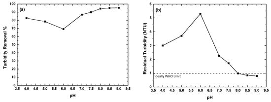 Effect of pH values on (a) % turbidity removal, (b) residual turbidity, when treating simulated surface water samples, for an initial turbidity of 17.2 NTU and coagulant dosage of 10 mg/L, regarding the application of the optimal GO-PFSiC1.5-15-0.5 material.