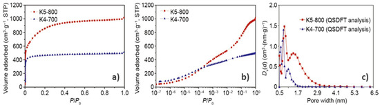 Surface area is the crucial parameter to optimize porous carbons for many applications, including hydrogen storage. In fact, as we discuss in more detail below, it has been shown that particularly at low pressures and at low temperatures (e.g., 77 K) the amount of hydrogen adsorbed on a carbon material is determined mainly by its accessible surface area coupled with well defined, narrow micropore size distribution (PSD) [26,27]. For instance, at this temperature, it is assumed that the amount of hydrogen adsorbed gradually increases by 1 wt.% per 500 m2 g−1 of surface area for carbon adsorbents. This behavior is generally known as “Chahine’s rule” [28]. However, the assessment of reliable surface area for nanoporous carbons is challenging.