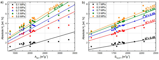 Figure 3a shows the absolute hydrogen uptake at 77 K as a function of ABET when the adsorption pressure increases from 0.1 to 5 MPa. It can be seen that the determination factor increases with the storage pressure due to the higher surface coverage, and the trend approaches the Chahine’s rule only at 5 MPa. However, the determination factor is still far from 1, which is certainly reflecting the discussed limitations of the BET method for surface area assessment. Hence, in Figure 3b, the absolute hydrogen uptake was plotted as a function of SNLDFT (using 2D-NLDFT model) instead of ABET as in Figure 3a. The determination factor at each considered pressure increases considerably when compared to those given in Figure 3a, although at 0.1 MPa it is still quite low (R2= 0.48), which confirms that a more accurate surface area for these carbons could be obtained by applying 2D-NLDFT instead of the BET method. In addition, the fact that SNLDFT was obtained from a combination of N2 and CO2 adsorption allowed assessing pores smaller than 0.6 nm, where hydrogen is preferentially adsorbed [44,45,46]. Consequently, even more accurate surface areas and correlation with hydrogen storage should be obtained by using H2 instead of CO2 (e.g., coupled with N2) characterization [23]. At pressures higher than 0.1 MPa, the pores are progressively filled and the effect of the pores that are not accessible to CO2 is less important.