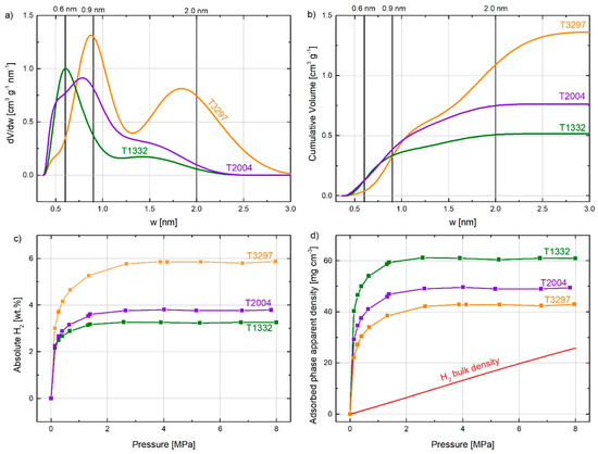 The open literature on hydrogen adsorption reports a significant number of carbon materials with similar ABET values but very different H2 uptakes [5,44,47,48,49,50,51] at 77 K and at pressures lower than 3 MPa. This could be explained by their very different PSD, which is unfortunately not often taken into account. Figure 4a,b, respectively, show the PSD and cumulative pore volumes as a function of pore width for three ACs having very different values of ABET, i.e., 1332, 2004, and 3297 m2 g−1 (labeled T1332, T2004, and T3297, respectively). This figure also shows that an increase in ABET is accompanied by pore widening if ACs are synthesized by KOH or NaOH activation. T3297 therefore has higher volume and fraction of wider pores and, on the contrary, the pore volume corresponding to pores narrower than 0.9 is smaller because these pores merged into wider pores. Figure 4c shows absolute H2 adsorption isotherms for these three ACs. At low pressure (around 0.3 MPa), the ACs show similar uptake but, at higher pressure, the H2 uptake is correlated to the total pore volume. This figure also shows that ACs with a higher fraction of narrow pores reach the maximum uptake at lower pressures than those having a greater contribution of wider pores. Based on the H2 uptake at each pressure and the total pore volume of each carbon, it is possible to plot the evolution of the average density of the adsorbed hydrogen with pressure (see Figure 4d). This graph shows that the carbon material with the highest percentage of narrowest pores, below 0.6 nm (T1332), has a higher average density than the one with the largest surface area and wider pores (T3297). T2004, with intermediary PSD between T1332 and T3297, also shows an intermediary average density of the hydrogen adsorbed. For the sake of comparison, the evolution of the H2 bulk density with pressure at 77 K is also shown in the same figure. The average densities of adsorbed hydrogen were around 4.6, 3.8, and 3.2 times that in the bulk phase for the T1332, T2004, and T3297, respectively, at 4 MPa.