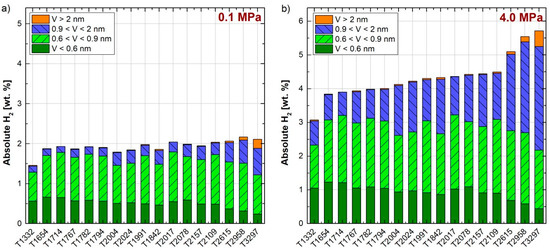 Equation (1) was applied to four ranges of pore width: narrower than 0.6 nm; between 0.6 and 0.9 nm; between 0.9 and 2 nm; and wider than 2 nm. The first range was based on the kinetic diameter of the hydrogen molecule, 0.296 nm [23], thus 0.6 nm is approximately the pore width to accommodate two layers of adsorbed H2, one on each wall. The second range of pore sizes, 0.6–0.9 nm, was considered to accommodate three layers of hydrogen molecules between the pore walls. The pore size range of 0.9–2 nm was considered to complete the micropore range. The fourth pore range corresponds to the pores wider than 2 nm, i.e., mesopores, which also present in high-surface activated carbons. Figure 5a,b shows the absolute hydrogen adsorption at 77 K and 0.1 MPa and 7 MPa, respectively, on each of the 17 lab-made ACs [5], and the contribution of each of the four pore size ranges. From these figures, it can be concluded that the contribution of the narrow pores to the total hydrogen storage capacity is more relevant at low pressure, in good agreement with Figure 4c. By increasing the storage pressure, the absolute hydrogen adsorbed increases and wider pores are necessary to reach such a high storage capacity. Although the optimal pore width for hydrogen storage should approximately be 0.6 nm [45,46,54,55,56,57] and the maximum density in these pores is reached at 1 MPa, it is not possible to obtain high surface ACs with unimodal PSDs. Therefore, pores wider than 0.6 nm and pressures higher that 3 MPa are essential to reach high hydrogen storage capacities at 77 K.