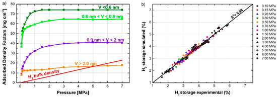 Figure 6b shows the good fit of Equation (1) to the experimental H2 isotherms for each pressure considered. In addition, the global determination coefficient, considering all the pressures, was 0.98. The ADF values obtained at 1 atm were 40, 37, 9, and 8 mg cm−3 for the four ranges of pore width <0.6, 0.6–0.9, 0.9–2, and 2–50 nm, respectively. These ADFs are close to the average values, i.e., 58, 38, 13, and 8 mg cm−3, respectively, estimated from hydrogen densities calculated for selected pore widths [23].