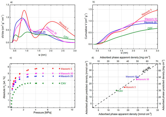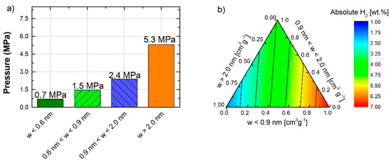To represent better the effect of the PSD on hydrogen adsorption, Equation (1) was applied to a hypothetical material with a total pore volume of 1.0 cm3 g−1. The theoretical absolute adsorptions of hydrogen on ACs with different PSD were calculated for a pressure of 4 MPa and are presented in Figure 8b. The results show that a carbon material composed mainly of pores narrower than 0.9 nm can have a hydrogen adsorption capacity of more than 6 wt.%. On the other hand, a material composed exclusively of mesopores will have a capacity of less than 2 wt.% for the same total pore volume.