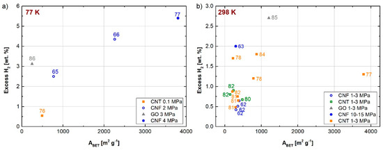 Excess hydrogen uptakes on CNFs, CNTs and GOs reported by recent works at: (a) 77 K; and (b) 298 K. The labels indicate the corresponding references.