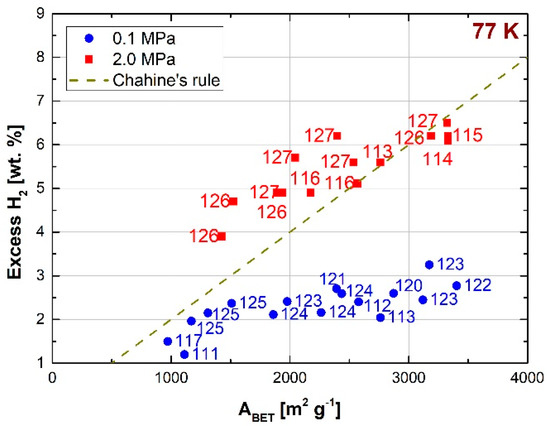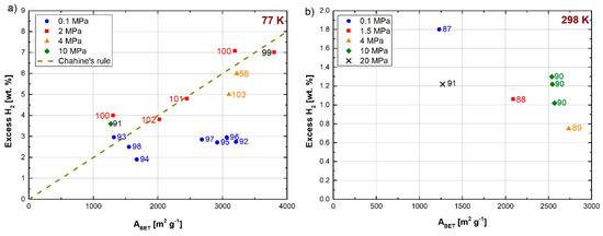 Figure 10a shows the hydrogen uptakes (in excess) obtained for ACs at 77 K reported in recent years. The hydrogen uptakes measured above 1 MPa follow the Chahine’s rule. The data measured at 0.1 MPa do not exceed 3 wt.% for ABET as high as 3000 m2 g−1. Figure 10b shows the hydrogen uptakes (also in excess) reported for ACs at 298 K. At this temperature, the averaged hydrogen uptake barely exceeds 1.2 wt.% for any value of ABET.