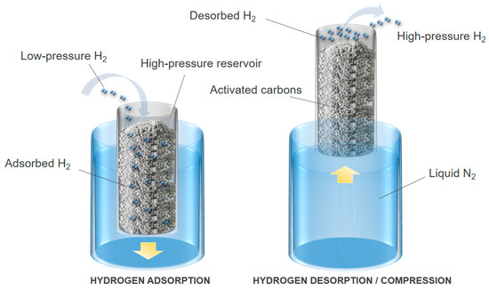Figure 12 schematically shows the operating principle of a thermally driven adsorption–desorption compressor that can be described as a thermodynamic engine in which the compression is controlled by heat transfer between the compressor tank and the environment of the system. Hydrogen compression derives from the desorption of a pre-adsorbed amount of hydrogen on a porous material, as a consequence of the passage of hydrogen from the adsorbed phase, which is denser, to the bulk gas phase in a confined tank volume. Hydrogen desorption is obtained by increasing the temperature of the system [149]. The efficiency of an adsorption–desorption compressor is related to the hydrogen adsorption capacity of the porous material but also to the amount of material that can be introduced into the tank. Indeed, the higher is the amount of hydrogen adsorbed at low temperature, for instance at 77 K, the higher is the amount of high-pressure hydrogen discharged by the compressor.