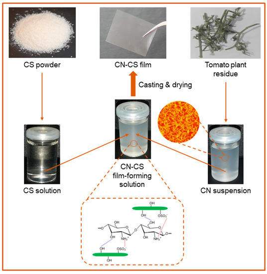 The mixture of CS and 10 wt% CN is simple to achieve under controlled conditions, allowing a homogeneous and stable aqueous mixture to be formed. Films with high quality, flexibility, and smooth surface were developed by casting these solutions on Petri dishes and evaporating of the solvent water in this case.