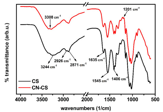 The chemical structure of CS and CN–CS was evaluated using Fourier transform infrared spectroscopy (FTIR, Perkin-Elmer Spectrum 2000, PerkinElmer, Inc., Waltham, MA, USA) equipped with ATR accessory. The FTIR spectra were recorded in the 4000–600 cm−1 range with a resolution of 4 cm−1 and an accumulation of 16 scans.