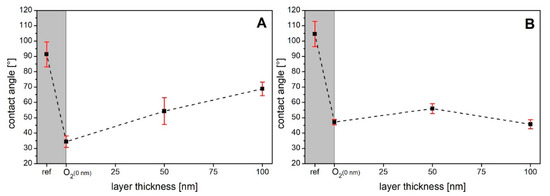 Contact angle measurements: (A) for CS and (B) for CN–CS with the results for the raw samples, the O2 plasma treatments (representing the layer thickness of 0 nm), and the 50 and 100 nm a–C:H coatings. The dashed lines only indicate a trend. The grey box includes the O2 plasma pretreatment of each raw substrate.
