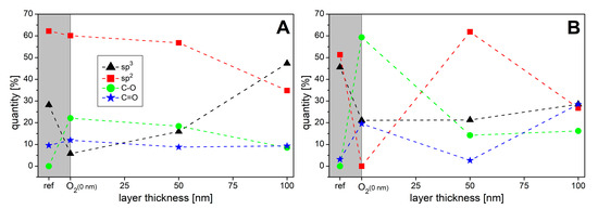 The results for the CS are shown in Figure 5A. The carbon atoms on the surface of the raw CS are 62% sp2 bonded, the proportion of sp3 bonds is 28%. If the sample is treated with O2 plasma, the proportion of sp2 bonds hardly decreases noticeably to 61%, the sp3 bonds drop to 6% due to oxygen treatment. While the C=O bonds remain almost constant, the C–O bonds increase strongly to 22% and thus a clear oxidation of the surface is recognizable. If a 50 nm a–C:H layer is deposited, the C–O and C=O bonds decrease. Also, the sp2 content decreases slightly to 57% in favor of a sp3 hybridized surface, which reaches a content of 16%. The previously oxygen plasma treated polymer is now covered with the a–C:H layer. If the layer thickness increases to 100 nm, the sp2 bonds decrease further and reach a proportion of 35%. The sp3 bonds increase to 48% and become the dominant bond present on the surface.