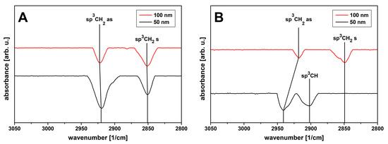 Figure 7A shows the DRIFT measurements for the a–C:H coated CS samples. Two oscillations are clearly visible: The sp3 CH2 (as = asymmetric) oscillation at 2920 cm−1 [50,51] and the corresponding sp3 CH2 (s = symmetric) oscillation at 2851 cm−1 [50,51]. For the 50 nm a–C:H layer thickness, the sp3 CH2 (as) peak also appears to overlap with the sp3 CH oscillation at 2902 cm−1 [51]. If the thickness is increased to 100 nm, there is a small shift to 2922 and 2852 cm−1, respectively, for both oscillations. This shift to a higher wavenumber indicates that the carbon–hydrogen bonding energy has increased. Therefore, the carbon–hydrogen bond distance for the =CH2 group has decreased [29]. This change in the bond spacing has already been demonstrated for such a–C:H coatings on several (bio)polymers [2,5,6,11,13,18]. The overlapping sp3 CH bond also disappears at 100 nm thickness.