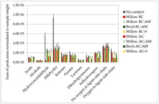 Based on the preliminary test, there were minor changes on vapor formation if the same catalyst was repeatedly used. Therefore, the catalyst was replaced after every run. Results of thermal pyrolysis run and four pine pyrolysis vapors post-treatments using the same original willow AC are presented in Supplementary Material (Figures S1 and S2). It was noticed, in particular, that willow BC, willow, and birch acid-washed BCs and sulfonated willow BC contained organic components that were released in post-treatment together with pyrolysis vapors. Some of the compounds (guaiacol, 4-methylguaiacol, vanillin, homovanillin, 1,5-Anhydro-4-deoxypent-1-en-3-ulose, 1,6-anhydroglucopyranose) were the same as the compounds present in pine wood vapors. Hence, two pyrolysis runs without biomass were performed as a pretreatment for biochars and ACs, to remove the unwanted components before the actual post-treatments. Total ion chromatograms of post-treated pine pyrolysis vapors using pretreated willow BC and willow AC as catalysts are presented in the Supplementary Material (Figures S3 and S4).