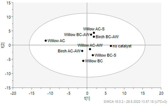 Multivariate data analysis for pyrolysis data (Table A1), using principal component analysis (PCA), was carried out with SIMCA-15 (Umetrics AB, Umeå, Sweden), according to the same procedures that have been reported elsewhere [16]. Two principal components were calculated for the data set. The obtained score plot shows how the biochar and activated carbon catalyst treatments differ from each other and from the thermal pyrolysis (no catalyst).