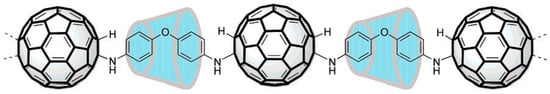 An assembly consisting of two linked C60 molecules was synthesised by Wudl et al. in 1992 [8]. This could be considered the first step towards a pearl necklace polymer. The synthesis involved reacting C60 with the diazomethanes derived from m-phenylenebis(benzoyl) and p-phenylenebis(benzoyl). Early attempts to prepare extended pearl necklace polymers often resulted in intractable, insoluble mixtures, e.g., [9]. In 2000, Geckeler et al. reported the synthesis of the first water-soluble C60 main-chain polymer [10]. Here, the linking groups were shielded inside cyclodextrin cavities with the fullerene, as shown in Figure 2. They showed that the fullerene retained its ability to cleave DNA nucleotides via a singlet oxygen transfer at the guanosine base sequence when attached to this polymer.