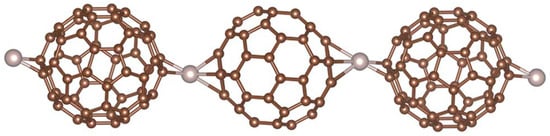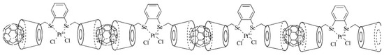 Organometallic C60 polymers have attracted significant interest. The first example of such a polymer was a pearl necklace structure synthesised in 1992 by Nagashima and colleagues [33]. By mixing C60 with Pd2(dba)3, where dba is dibenzylideneacetone), with 1:1 stoichiometry, these workers obtained a linear C60Pd polymer. They also showed that changing the Pd:C60 ratio or heating the one-dimensional polymer could produce three-dimensional polymers. Since this early work, many further polymers with fullerenes covalently bonded to palladium, platinum and other transition metals have been synthesised, e.g., [34,35,36]. The polymers can be one-, two- or three-dimensional. Figure 4, from work by Leng et al. [36], shows a linear organometallic polymer. A theoretical analysis of the interactions between Pd and fullerenes in polymers has been given by Goclon and colleagues, who found that the most stable polymer structure is one in which the C60s are bonded via the [6,6] position of the fullerene molecules with Pd in a distorted tetrahedral coordination [37]. Organometallic C60 polymers may have potential applications in catalysis [34,38], electrochemistry, e.g., [7,35], and other areas.