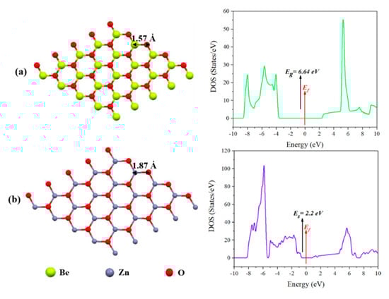 - Wu, W.; Lu, P.; Zhang, Z.; Guo, W. Electronic and Magnetic Properties and Structural Stability of BeO Sheet and Nanoribbons. ACS Appl. Mater. Interfaces 2011, 3, 4787–4795. [Google Scholar] [CrossRef]