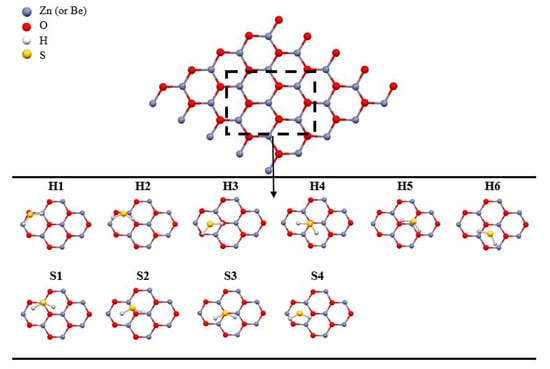 - Rodriguez, J.A.; Maiti, A. Adsorption and Decomposition of H2S on MgO(100), NiMgO(100), and ZnO(0001) Surfaces: A First-Principles Density Functional Study. J. Phys. Chem. B 2000, 104, 3630–3638. [Google Scholar] [CrossRef]